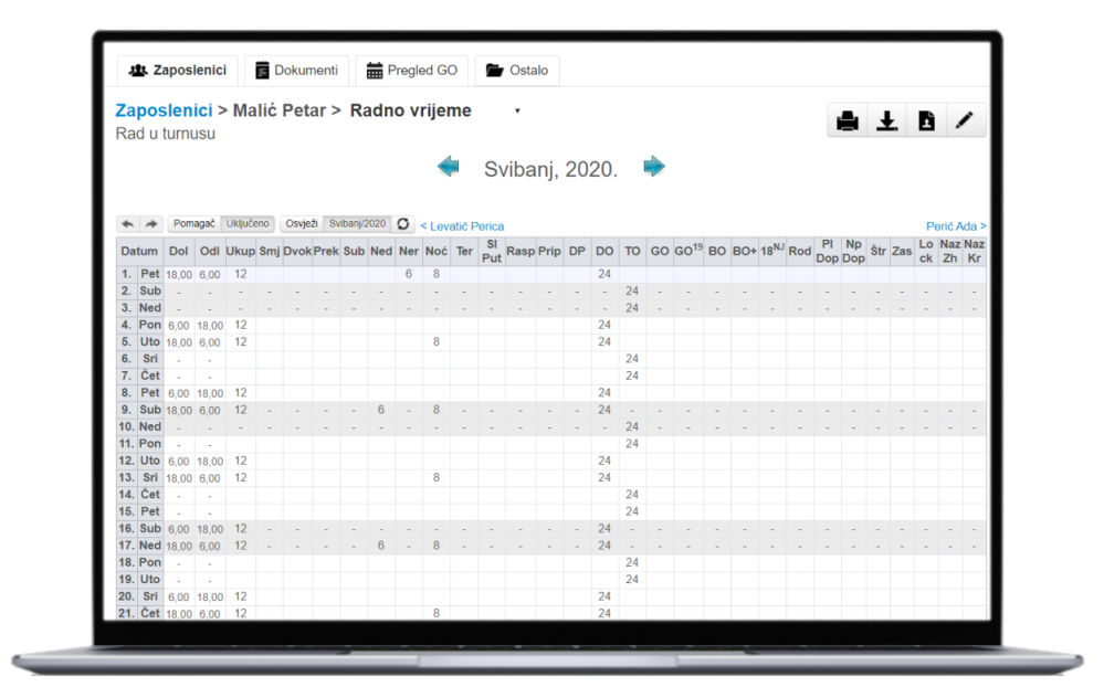 • Podržavanje svih oblika rada: smjenski, dvokratni rad, rad na terenu, preraspodjela, turnus